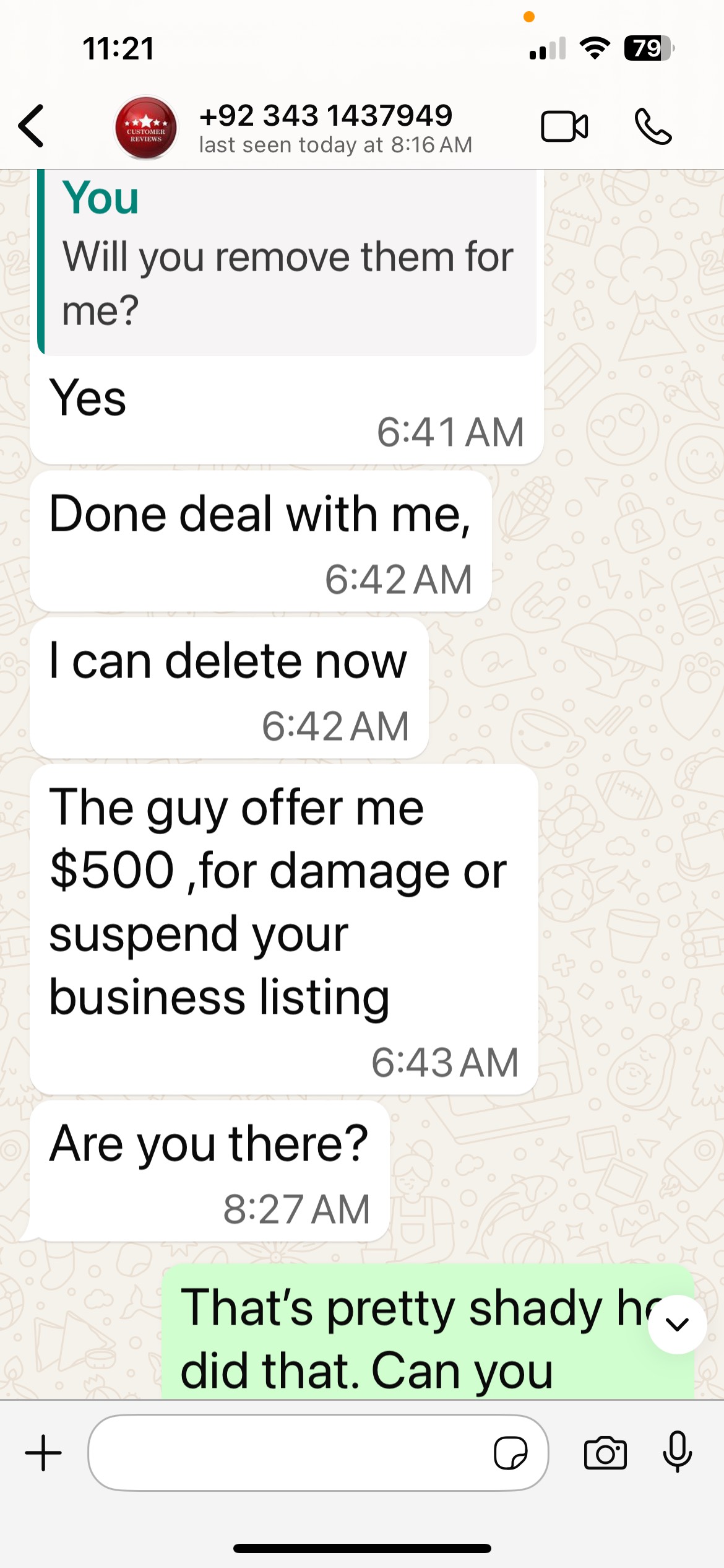 A Spam Fake Reviewer is attempting Extortion. The fake 1 star reviews have been reported to Google. Here in the below images is our communication with the person giving us the recent fake 1 star reviews. 8-1-2025